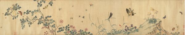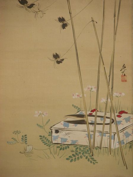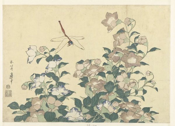 Editor: This delicate watercolor and ink work on paper is "Autumn Flowers" by Oki Ichiga, from the mid-19th century. The muted palette creates such a sense of tranquility. How would you analyze the formal elements at play here? Curator: Indeed. Note how the artist deftly uses line to define the delicate flora, yet avoids harsh outlines. The washes of color, predominantly earthy greens and soft purples, create depth through subtle gradations. The dragonfly, positioned with precision, acts as a visual counterpoint to the density of the lower portion of the composition. Do you observe the subtle asymmetry? Editor: I do! The asymmetrical balance feels very intentional. The artist avoided placing elements symmetrically to create a sense of depth and movement. Curator: Precisely. The empty space surrounding the foliage and insect directs the viewer's eye upwards, allowing a prolonged visual journey. Consider how the negative space is not merely background but an active component in shaping our perception of form. Editor: That’s fascinating! The way you describe it, it’s almost like the background has equal visual weight to the foreground, or at least significantly complements it. What effect would a symmetrical rendering have had? Curator: A symmetrical arrangement may risk predictability, thus flattening the spatial and emotional resonance we perceive here. The tension, subtly introduced through asymmetry and color contrast, serves the expressive intention of the piece. Editor: I hadn’t considered how symmetry could alter the overall effect so drastically. I see how it creates an elegant arrangement. Curator: In essence, this piece presents an orchestrated visual experience through its refined use of line, color, and spatial arrangement, moving beyond mere representation. Editor: Thanks so much for offering a more precise, detailed look. I have a far greater appreciation of Oki Ichiga's piece now.