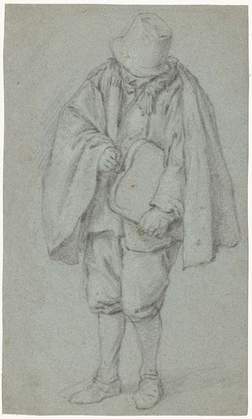 Curator: We’re looking at Adriaen van Ostade's "Study of a Standing Peasant," a pencil drawing created around the 17th century. It’s an intimate portrayal, sketched on a canvas with a lovely blue ground. What strikes you most when you first see it? Editor: Immediately, the stoicism. There's a profound weight conveyed by this man’s posture. The figure leans heavily on what appears to be a ledge, his gaze lowered, suggesting not just weariness but perhaps also a resignation born of socio-economic circumstances. Curator: That's perceptive. Van Ostade, working in the Dutch Golden Age, often depicted scenes of everyday life, and this is characteristic of his attention to the peasantry. Genre paintings, these snapshots of the common man, became increasingly popular. This drawing is fascinating, because it's not the complete, romanticized picture but the start of it—a study of what's often rendered as humorous or simple. Editor: Yes, and I find it important to ask, who gets to create and disseminate these images of the peasant class, and to what end? While these genre scenes could be interpreted as straightforward depictions, it’s equally essential to examine them critically. Curator: Absolutely. And consider this drawing in light of the burgeoning art market during the Dutch Golden Age. Artists needed to produce constantly, to generate material quickly. Studies like these are often quick sketches, almost preparatory for larger paintings, meeting this commercial demand. But it does show van Ostade’s interest in showing people as they are. Editor: Perhaps "as they are" within a frame dictated by market forces and the tastes of a buying public removed from the realities of peasant life. Yet there’s undeniable artistic skill at play in van Ostade’s draftsmanship here—the expressiveness captured in just a few pencil strokes. His economic class is communicated through his hunched posture, and perhaps he's reflecting on an exhausting day of work. This may be a romantic perspective, but how often are laborers offered dignity in artistic portraits? Curator: A thought-provoking question that remains central to conversations around representation today. This sketch serves as a reminder that art, even in its preliminary forms, carries layers of socio-economic implications, inviting us to analyze not just what is depicted, but also who is doing the depicting, and why. Editor: Indeed, looking closer, perhaps this art makes us question our own roles in upholding or dismantling the narratives. It is a humble art piece, rendered with beautiful consideration and artistic capabilities.