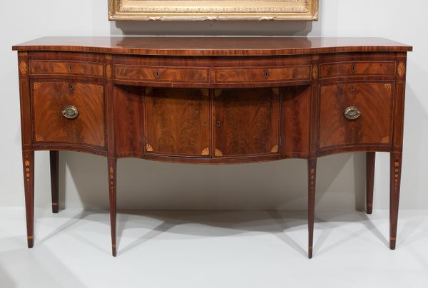 Curator: What a wonderfully imposing piece of furniture. This is a sideboard, created anonymously, sometime between 1825 and 1835. It's currently held here at the Art Institute of Chicago. Editor: My immediate impression is one of formality. The symmetry is almost austere, yet the wood grain has this incredible swirling texture that prevents it from feeling cold. Curator: Precisely! The piece reflects the Neoclassical style which was pervasive during this period. Furniture like this was about signaling status. Its presence in a dining room signified wealth and a certain cultivated taste. The choice of wood, likely mahogany, also speaks volumes. Editor: The dark wood creates this sense of groundedness, especially at the base with those chunky, ornate feet. And then your eye is drawn upward by the triangles inlaid on either side. It's a fascinating use of geometric forms. Curator: These forms are derived from classical architectural details. Think of the columns and pediments of Greek temples, translated into domestic furnishings. It's about connecting oneself to a lineage of power and civilization, even within the home. These pieces often stood in specific rooms as well, as that had sociopolitical implications. Editor: I see that tension now, between the handcrafted nature of the woodwork—look at that roped edge detail along the central cabinet—and this grand, almost manufactured impression it gives. It's trying to have it both ways, isn’t it? Luxurious and a product of the American classical vision. Curator: Very much so. To own a sideboard like this meant participating in a visual language of social hierarchy, expressing power and aspiration through decorative art. Owning such pieces signified a lot to people who were on the rise at the time. Editor: Considering its cultural context really unlocks another layer of understanding. It is quite remarkable how functional pieces such as this tell larger stories, doesn't it? I now see the blend of textures and patterns not merely as decorative, but as intentional strategies of conveying the image one wanted others to perceive them. Curator: Indeed. Each carefully chosen element reveals a fascinating tableau of early American society. Editor: The composition truly is so balanced; and now that I understand its meaning, it's rather intriguing.