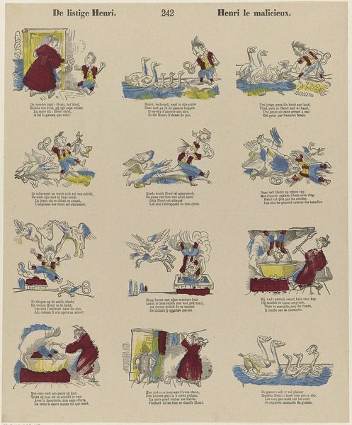 This print, made by Brepols & Dierckx zoon, presents a series of vignettes depicting two characters, Natie and Ignace, engaged in various boastful and foolish scenarios. Animals—lions, bears, and geese—are presented with human qualities. Consider the recurring figure of the lion: traditionally a symbol of courage and royalty, here it's mocked and outwitted. This recalls the ancient fable tradition, where animals served as allegories for human follies. We can trace this back to Aesop and see echoes in medieval bestiaries, where the symbolic weight of animals was used to impart moral lessons. The persistence of animal symbols speaks to our collective need to understand ourselves through the lens of the natural world. These images touch on a deeper, psychological level, tapping into our primal fears and desires. The mocking and the mocking of the lion—a king of beasts—resonates with the Freudian idea of the "return of the repressed." The animal motif, used to convey a sense of superiority over nature, reminds us of the complex interplay between our conscious and unconscious minds.
