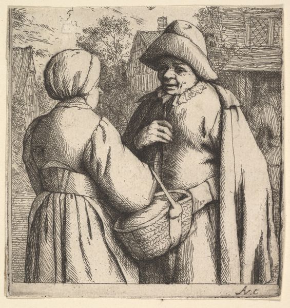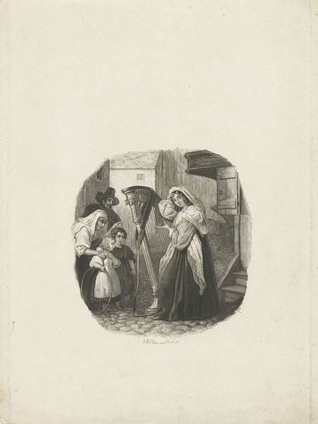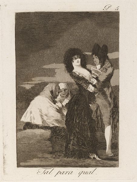 This is Pobrecitas!, one of Francisco Goya's etchings, which employs stark contrasts and aquatint to achieve dramatic tonal effects. The composition is built around a cluster of figures set against a looming, undefined background. Goya's technical approach here is masterful. The aquatint gives a granular texture, heightening the emotional intensity. We see the stark juxtaposition of light and shadow that draws our attention to the figures’ expressions and gestures. The artist's manipulation of light is not just descriptive; it is a powerful tool for conveying psychological depth. The heavy shadows can be interpreted through the lens of existentialism, reflecting themes of despair and the human condition. Are the expressive lines and tonal range used by Goya to challenge fixed meanings, engaging with new ways of thinking about power and representation? The interplay of light and shadow, is not merely aesthetic; it's a profound commentary on the struggles inherent in the human experience. Goya’s legacy resides in his relentless questioning and re-interpretation of humanity.