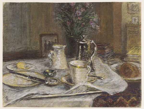 Editor: Here we have John Singer Sargent's "The Breakfast Table", currently housed in the Harvard Art Museums. The brushstrokes are so loose, especially on the tablecloth. What do you make of Sargent's focus here? Curator: Notice how Sargent depicts the material wealth through the objects: the silver, the fine china, the abundance of food. Consider the labor involved in maintaining such a display, the social class it represents, and the consumer culture it implies. Editor: So, it's less about the aesthetic pleasure and more about the...production? Curator: Precisely. By examining the materiality and the means of production, we uncover the social context embedded within this seemingly simple breakfast scene. We can better see what life was like at this time for the upper class. Editor: I hadn’t considered the labor involved, I was too focused on the flowers! Curator: By understanding the materials and their origins, we gain a deeper appreciation for the complex social dynamics at play.