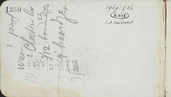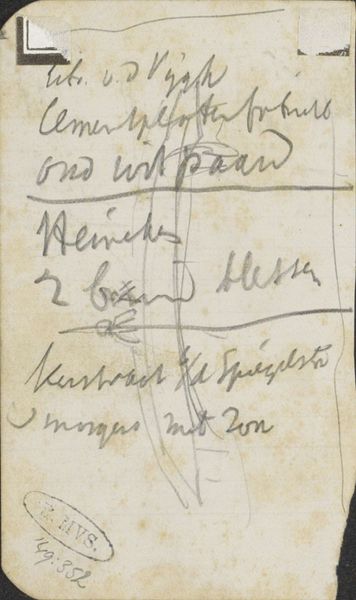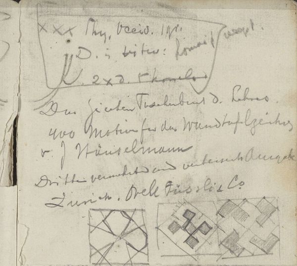 Curator: Here we have a work from around 1928, “Ornament met vissen” by Carel Adolph Lion Cachet. It’s a mixed-media drawing, a collage on paper with ink, currently held here at the Rijksmuseum. Editor: It feels very spontaneous and immediate, like looking directly into the artist’s thought process. The hand-written text and seemingly random figures give the piece a casual, almost unfinished quality. Curator: Cachet was quite active commercially. He was designing posters, carpets and textiles at this point in his career. So perhaps we should think about this not just as a sketch but also consider what is being ornamented and its context. The sketch features text that includes prices as well as phrases like "La place des sculptures." Editor: You're right, it reads almost as notes for a project! Note the lines of fading text and various sketches seemingly fighting for space. What is the overall visual rhythm suggesting here? Curator: He was an important figure within the Dutch Arts and Crafts movement, a movement keen to blur the hierarchy of fine art and the decorative arts. He explored different textures in printing. Think of those contexts, and the nature of Dutch mercantile activity at the time. You get the sense that the collage represents his creative process itself. Editor: The dominance of script typography is intriguing. How does the form of the lettering itself contribute to the ornament? It feels at once formal and informal. Curator: In this instance, the formal elements may signify particular styles in the typography that denote prices and names of addresses. Think of invoices from businesses in the late 1920s. He is sampling from, or creating a record of, the economic culture in Amsterdam during this period. Editor: That tension, that relationship you describe, that's what gives the work such visual energy. It’s less a polished final product, and more a raw, unfiltered moment of creative brainstorming. Curator: Exactly! The work is an excellent encapsulation of this very versatile, productive Dutch artist. Editor: Definitely offers an intriguing look at the artist's process. Curator: Precisely. Now, let’s move along to the next piece…