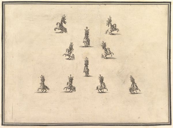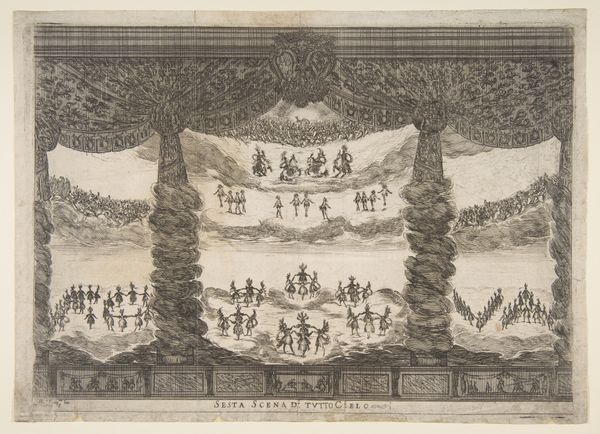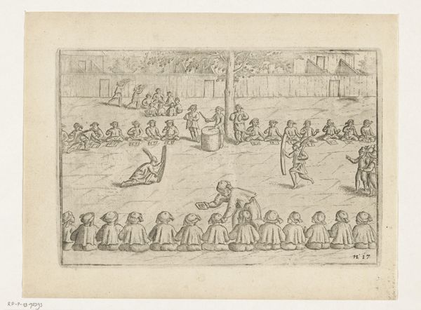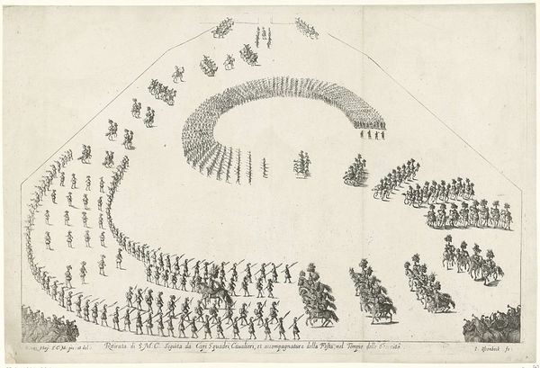 Curator: What a fascinatingly precise—yet unsettling—visual! All these rows and arcs, the identical ships, each emitting smoke... It’s almost mechanical, devoid of human emotion, despite depicting a battle. Editor: Indeed. Here, we’re observing “Slag bij Lepanto, 1571,” created by Frans Hogenberg between 1571 and 1573. It is an engraving that is part of the Rijksmuseum collection. And what we see displayed here is Hogenberg’s perspective on the naval Battle of Lepanto. The image’s meticulous composition reminds me of strategic diagrams from military history, the type crafted to rationalize complex geopolitical actions. Curator: Yes, there’s a real tension between its cartographic accuracy and the chaotic subject it depicts. The lines are crisp, definitive. I see meticulous arrangements, contrasting strongly with what would have surely been messy and devastating action on the water. How fascinating that line engraving can be chosen for its cool objectivity here! Editor: The choice of perspective is very interesting as well, isn’t it? Viewing from a detached bird’s-eye viewpoint gives an understanding of scale—hundreds of vessels arrayed—but diffuses all sense of actual battle. The ships of the Holy League, top, engage against the Ottoman fleet. Hogenberg’s image reinforces a particular narrative by visually dominating, the arrangement giving order to an event experienced perhaps as confusion. Curator: Agreed. Semiotically, each identical ship reads less as an individual vessel and more like a repeating motif—a symbol. Hogenberg seems intent to present order above chaos. It is tempting to see the lack of differentiating details across these vessels as evidence of authorial intention or commentary around both sides of this conflict in general. Editor: Precisely, and how these themes interplay. Scale, for instance: a single image designed to convey all this complex information. Consider the implications of turning something so immense and complicated into a consumable image during a time of heightened European tension. The visual’s legibility then becomes critical, serving a powerful role. Curator: So true. Now, looking once more with fresh eyes at Hogenberg’s design… Well, the way meaning is embedded into this is very thought-provoking. Editor: I couldn’t agree more. Considering the context, we see an impactful image which can bring so many historical ideas to bear, offering something of both propaganda and archival significance.