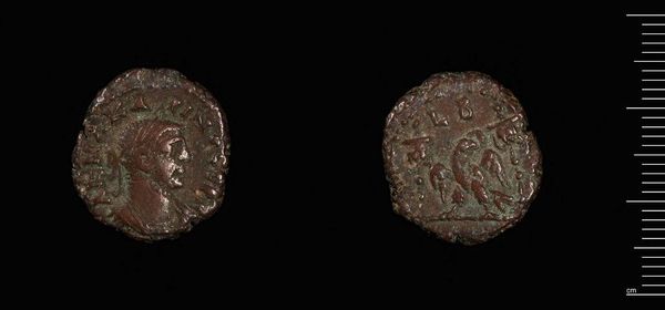 Editor: This is a Tetradrachm of Alexandria, a coin featuring Probus, from the Harvard Art Museums. It's small, but I see a portrait and what looks like maybe eagles on the other side. How do you interpret this work in its historical context? Curator: Coins like this were powerful tools of political communication. The portrait of Probus was a carefully crafted image designed to project authority and legitimacy. The eagle imagery? Editor: It might symbolize Roman power? Curator: Precisely. This coin wasn't just currency; it was propaganda, circulating ideas about Roman rule and imperial strength throughout Alexandria. It speaks volumes about how empires used imagery to maintain control. Editor: So, it’s not just art, but a political statement in miniature. Fascinating. Curator: Exactly! And seeing it in a museum today raises questions about its journey and our present-day relationship to imperial imagery.