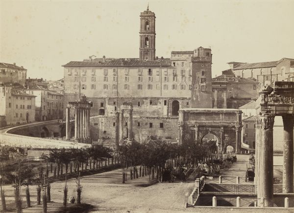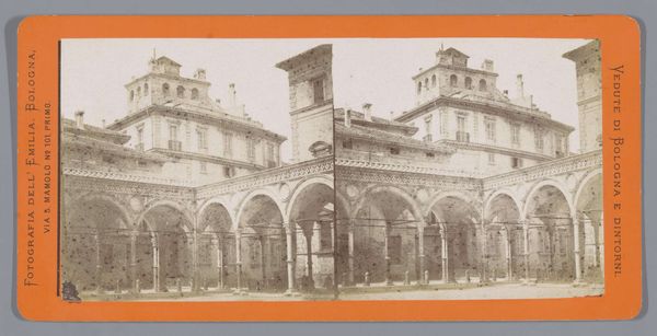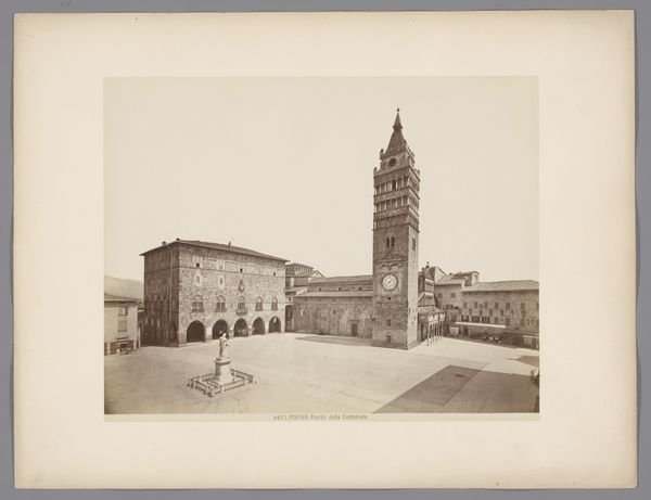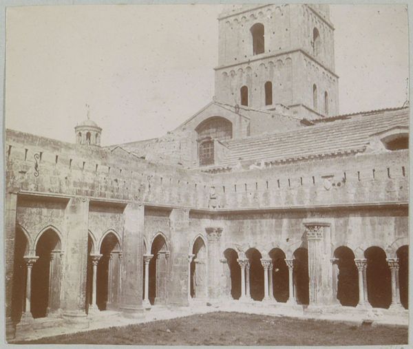 Curator: This photograph, taken by Fratelli Alinari between 1875 and 1900, presents a “View of the Basilica of Sant’Ambrogio in Milan.” It's a gelatin silver print. Editor: It's a surprisingly calm image, considering it's a city scene. There's a quiet grandeur to it, a weightiness in the architecture rendered through the photographic process itself. You really get a sense of the materiality, even in this two-dimensional representation. Curator: Precisely. The basilica itself is fascinating. Its history speaks to a complex intertwining of power, religion, and civic identity in Milan. Constructed in the 4th century, rebuilt in the 11th, it is rich in cultural significance that marks a pivotal juncture in European history. Editor: Look at how the photograph itself functions almost like a historical document. The gelatin silver printing process—consider the labour, the techniques involved in creating such a reproducible image. What's interesting is the intersection between craftsmanship and mass dissemination. The materiality makes accessible and repeatable, at the expense of individuality. Curator: That’s a valid point. However, thinking through the lens of identity, the image becomes part of the grand tour narrative for elite travelers. Images like these were collected as proof of one’s experience in the city and signal an affiliation with certain historical values. To ask a question of gender, who holds that power? Who does it exclude? Editor: But isn’t it also about access? Suddenly a broader audience can participate with art because of advancements of the materials themselves? Look how the light interacts with the structures. I am mostly engaged by the interplay between representation, the physical substances that give the work substance, and the labor invested to create art and to disseminate it. Curator: This exchange has me wondering, what stories are missing? Which individuals and populations, particularly within the frame and labor involved in the Basilica itself, are elided? This conversation itself signals that there can be numerous lenses when evaluating a single artistic moment. Editor: And those materials persist even after other social aspects evolve. We should perhaps, focus less on who did what to the structure, but instead allow the artwork to take precedence. I remain committed to acknowledging and considering art’s making before assigning power or influence based on factors we don’t completely know.