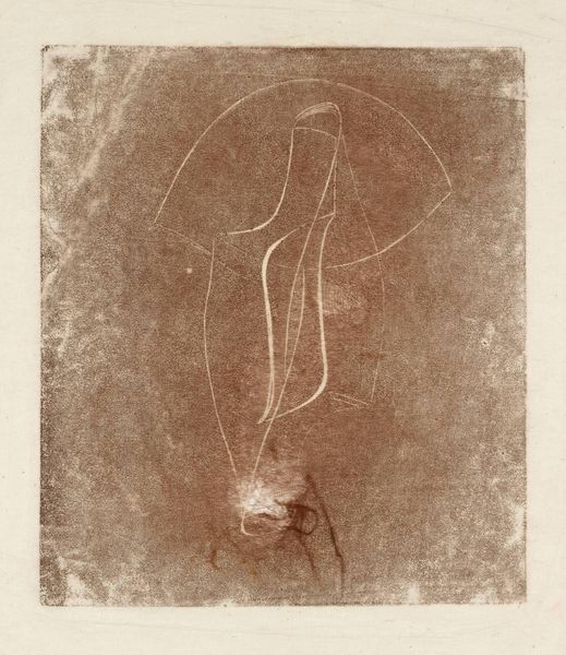 Curator: This is an untitled work by Naum Gabo, a pioneer of Constructivism. It's a small etching, just 160 by 140 millimeters, currently residing in the Tate Collections. Editor: It looks like a ghostly apparition emerging from a smoky dream! I find the lines so delicate, almost tentative, yet they suggest a powerful, unknown form. Curator: Gabo was fascinated with how industrial materials and processes could generate new artistic forms. Printmaking allowed for multiples, making art more accessible, less about unique craftsmanship. Editor: Right, but it’s more than just replication, isn't it? I see a search for something… beyond the material. The lines almost feel like a dance, a reaching for something ethereal. It makes me think about the dreams of progress and industry, somehow. Curator: Interesting take. His engagement with materiality and process moved away from traditional sculpture’s mass, towards the use of line to imply form. Editor: Well, whatever his intention, I am left with an impression of something both fragile and strong, industrial and spiritual. It’s a lovely contradiction.