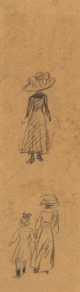 Curator: Whistler’s drawing, Woman with Parasol, likely dating from the early 1870s, immediately gives us an intimate sense of the sitter through very economical means. Editor: Indeed, the lack of detail makes the figure feel less specific, almost universal. The muted palette evokes a quiet, contemplative mood. The parasol itself casts her face into shadow, rendering her anonymous yet elegant. Curator: For Whistler, even these sketches, rendered simply in pencil, reflect a studied engagement with design principles; we observe the movement created by her drapery contrasted by the object-like finality of the parasol she holds. The brown paper itself contributes materially to the sense of atmosphere, acting almost as a light source illuminating the strokes. Editor: Yes, the brown paper breathes life and warmth into the grey lines. I am also struck by the downward reach of her hand toward that curious cluster of shapes beneath her. Could this suggest a forgotten offering, or the lost treasures from a fallen empire? It gives off an intensely symbolic meaning. Curator: I see the symbolism, yes. The placement of this form is rather curious isn't it. I might be inclined to see that as a record of process in production instead, an incidental tracing or blot perhaps, incorporated, or even ignored in the overall composition. Editor: Perhaps, yet I still feel it resonates symbolically, even on a subconscious level. Like a hidden map, it stirs thoughts of far-off places. What this woman's past beholds, it must weigh as heavily on her as that cumbersome parasol she's holding. Curator: In the end, perhaps Whistler himself knew and sought that ambiguity in form: to evoke both a material reality, but to leave space for his figures to breathe with independent possibility and, frankly, production. Editor: An excellent point. I walk away from this image thinking not just of this single woman, or drawing but of those mysteries and those unsaid memories contained within the human mind. Thank you for providing additional layers and nuance of meaning today!