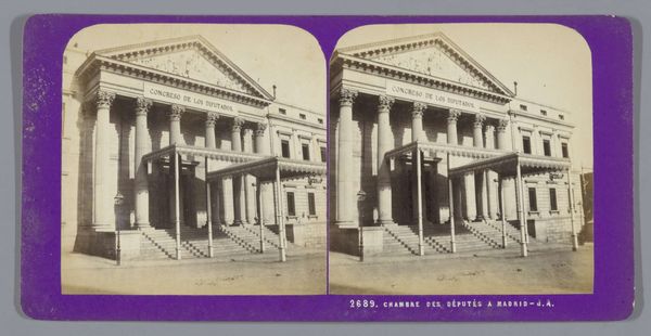 Curator: This stereograph offers us a glimpse into London between 1850 and 1919. The print captures the Chapel Royal, Whitehall, presented as "foreign scenery" for presumably, an American audience. Editor: It strikes me immediately how the parallel images create an almost tangible depth. The monochromatic tones lend a timeless quality, and I'm drawn to the play of light across the stone facade, highlighting its geometric forms. Curator: Precisely! These stereographs were immensely popular. They offered a portable form of tourism, reinforcing notions of cultural identity and difference. The architecture speaks volumes about British Imperial power, carefully consumed as a visual commodity. Editor: Look at the carefully articulated rows of windows, each framed by decorative mouldings, that rhythm structures the visual experience, directing the eye along the building's elegant length. It emphasizes the formal, restrained quality of British classicism. Curator: Consider the politics embedded here. Viewing a place like the Chapel Royal, so deeply tied to the monarchy, through the distancing lens of "foreign scenery," allowed consumers to participate in a vicarious and ultimately safe engagement with power structures. Editor: The photographer certainly frames the structure to emphasize balance and clarity, ensuring the visual narrative adheres to traditional values of representation, the facade, unblemished. Curator: But also, how interesting that this religious building is viewed like other cultural imports, displayed for widespread distribution across class and geographical distance as simply, more, visual empire. Editor: Indeed. I'm left contemplating the starkness and formality of the composition. It feels staged, doesn't it? Curator: Exactly. A carefully mediated image for an eager public. Editor: It's remarkable how such simple tonal range evokes an atmosphere and place long gone. A beautiful yet subtly unnerving captured moment.