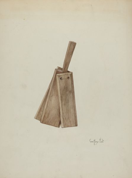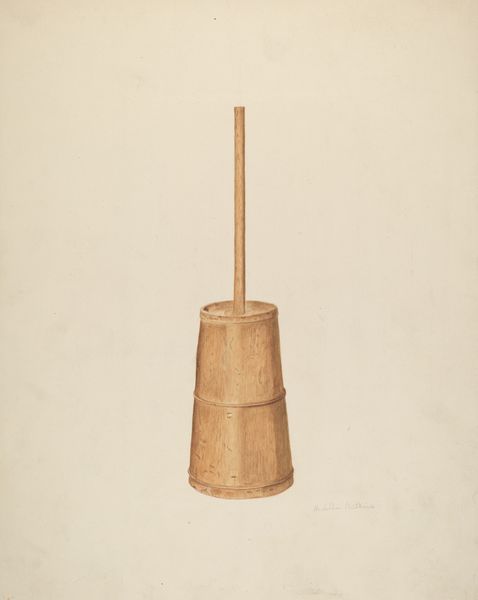Curator: Before us is "Rush Holder with Candle Socket," a pencil drawing created around 1937 by Wellington Blewett. Editor: It evokes a quiet stillness, doesn't it? The subdued color palette and isolated composition create a sense of solemnity. Curator: Indeed. The careful rendering and detailed attention paid to the surface qualities offer an aesthetic contemplation of the depicted object. Blewett really hones in on the subtle tonal variations. Note the almost tactile representation of the wooden base and the metallic gleam of the candle socket. Editor: Given that it's from the late 1930s, one wonders about its social context. Was it meant to evoke simpler times? Was there perhaps an appreciation of artisanal craftsmanship during this era? What role would that object had at home? The rendering looks pretty neat, probably it had the intent of appearing somewhere public, maybe like an industrial showcase. Curator: Good point! Beyond any nostalgia or specific functional references, formally, the artist utilizes contrasting geometric elements – the rounded candle socket, the straight central shaft, and the polygonal wooden base – to establish an overall balanced yet visually dynamic composition. Semiotically, this highlights a dialogue between different aesthetic orders. Editor: Perhaps the artist used pencil as the media in order to reflect in this case its industrial characteristics and functional goals. Curator: And the placement of the candle holder off-center introduces a tension that animates the work! The entire object assumes almost human-like traits, resembling a miniature construct with defined planes and angular articulation. It transforms an ordinary holder into a potent form of art. Editor: Agreed. This closer look reveals how this relatively humble, utilitarian artifact embodies broader artistic and cultural dialogues prevalent during that period. It pushes us to reconsider everyday items. Curator: Absolutely! A refined engagement with form, texture and representation challenges how we experience these types of mundane commodities within shifting societal spheres.