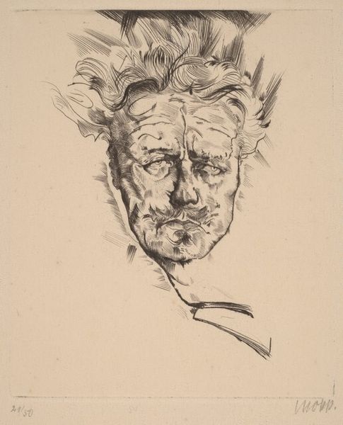 Editor: Here we have Max Slevogt's Self-Portrait, currently residing at the Harvard Art Museums. It's an etching, seemingly quite small. I'm struck by the rough quality of the lines. What can you tell me about this portrait? Curator: Let's consider the material conditions of its making. Etching, an accessible printmaking process, allowed for wider circulation. Slevogt, presenting himself, controls his own image and its dissemination. This challenges conventional portraiture commissioned by the elite. Editor: So, the choice of etching democratizes the self-portrait? Curator: Precisely. It shifts the power from patron to artist, aligning the act of creation with self-representation and wider consumption. Think of the labor involved, the materials used, and the intended audience. Editor: I see how the medium itself becomes a statement about artistic agency. Thanks! Curator: Indeed, a fascinating intersection of self and production.