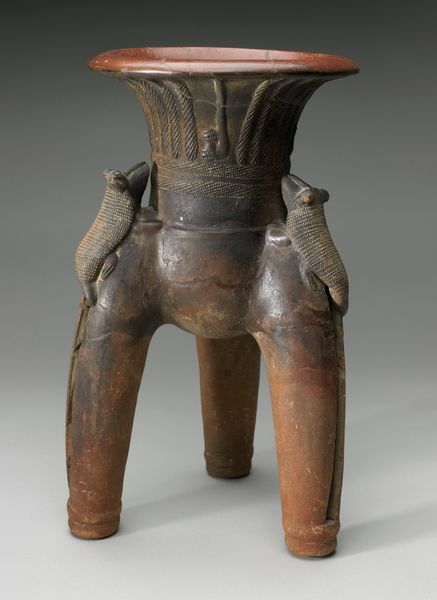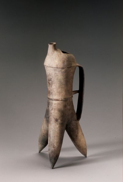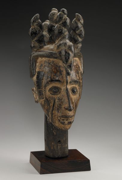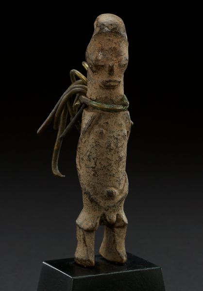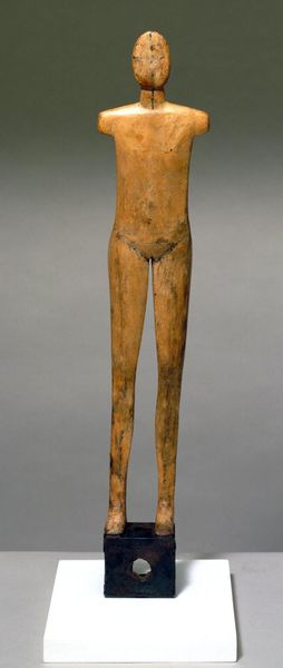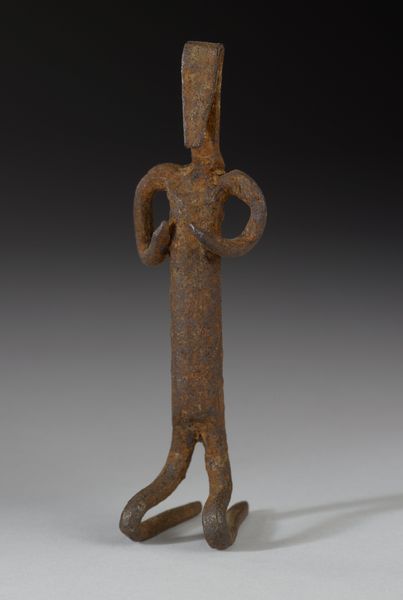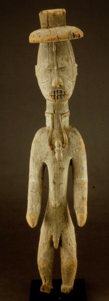 Curator: At the Minneapolis Institute of Art, we have an intriguing wooden sculpture entitled "Figure," likely crafted sometime between 1900 and 1950, and attributed to the Moba people. It strikes me as particularly raw and expressive. What's your take on it? Editor: I find it strangely haunting. The texture of the wood is so prominent, and those droopy extensions on either side of the torso suggest a sense of sorrow or burden, almost like weeping. The figure seems very stoic. Curator: Well, these figures often played a role in ancestor veneration and protection. Within Moba communities, they’re believed to house spirits and served as focal points for rituals connecting the living with the deceased. The sculpture becomes a medium through which socio-spiritual ties are enacted and reinforced. Editor: That certainly explains the palpable sense of solemnity. The material itself, the wood, feels so intrinsically connected to ideas of nature, origin, and history. Does the stylized anatomy suggest a symbolic language? The head, for instance, is so round. Curator: It's likely the artist aimed for generalized rather than individual features, emphasizing the figure's function within the communal ritual and beliefs. Stylization in such figures often prioritizes spiritual efficacy over naturalistic representation. We might view the bulbous head as signifying wisdom or connection to the spiritual realm, typical motifs we find throughout African art. Editor: It makes me wonder about the sculptor, their skill and intention as they worked with such a coarse material. To imagine the figure emerging from the block is quite powerful. Curator: It is. This “Figure” embodies the complex interplay between artistic creation and socio-cultural necessity that informs the ritual practices. So beyond its immediate visual impact, it allows insight into social relationships of the Moba people, which is a privilege. Editor: Definitely! The "Figure" stands as a potent reminder of how art can be deeply interwoven with spiritual life, offering insight into human values. It really embodies the saying, "Still waters run deep."