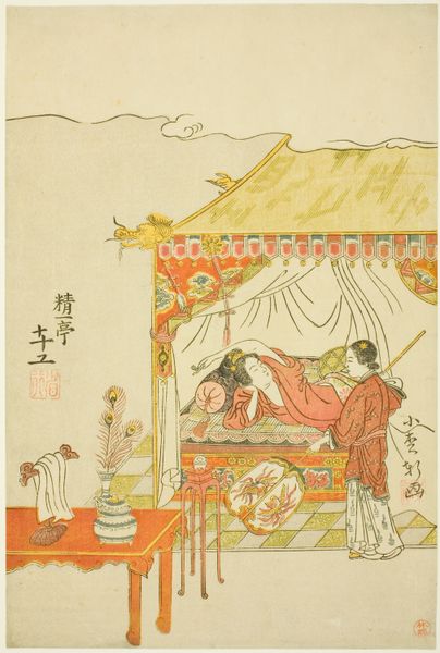 Tsukioka Kôgyo made this woodblock print, Kantan, part of the series "Pictures of No Performances," sometime in the late 19th or early 20th century. The print depicts a scene from a Noh play, a highly stylized form of Japanese musical drama. We see actors in costume, with one asleep under a simple shelter, dreaming of future success. The "Pictures of No Performances" series was produced in a period of rapid modernization in Japan, as the country opened itself to Western influences. Kôgyo and other artists looked to preserve traditional art forms in the face of these changes. Consider how institutions like the Noh theater helped shape Japanese cultural identity during this period. The print series could be considered both conservative in its subject matter, and progressive, in its appeal to cultural pride at a time of Westernization. Looking at archival material, such as theater programs and reviews, can give us a better understanding of the cultural role of Noh theater and prints like this one. It reminds us that the meaning of art is always tied to its specific social and institutional context.