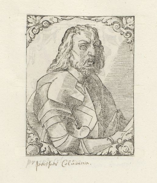Editor: Here we have an engraving entitled "Portret van Gonzalo Fernández de Córdoba." It appears to have been made sometime between 1549 and 1575 by an anonymous artist. I’m struck by the subject's rather severe expression and his slightly unsettling gaze. What can you tell me about this piece? Curator: This engraving serves as a window into the visual language of power and remembrance in the Renaissance. Consider the gaze you mentioned: in portraiture of the era, a direct gaze, especially in conjunction with the symbols of status like his elaborate hat and fur-lined garments, signaled authority and a desire to be remembered in a certain light. This wasn’t just a likeness; it was carefully constructed image. What do you notice about the frame? Editor: It's quite decorative, with those swirling patterns, almost like miniature sculptures. Does that have a symbolic purpose? Curator: Absolutely. Ornamentation, during the Renaissance, was rarely just decorative. The frame could be seen as both celebrating the individual and containing him within a visual order, reinforcing established societal hierarchies. He is celebrated as an individual but kept in his lane by use of renaissance decorative conventions. What do you make of his hands? Editor: They seem… fragile, clasped as they are. It's an interesting contrast to the confident gaze and opulent clothing. Curator: Exactly! The artist is playing with contrasts. The powerful figure isn't immune to the ravages of time. These choices reflect the Renaissance fascination with humanism - recognizing both strength and vulnerability. It seems like he may have something small in his hand. It isn't obviously a symbol, and he holds it lightly; perhaps it is something of small personal significance which lends him even greater vulnerability in juxtaposition to his regalia. Editor: That's fascinating. So, the image is designed to be both a celebration and perhaps a slight humbling of power? I'll definitely be looking for such subtle details in portraits from now on. Curator: Indeed. It reminds us that every artistic decision carries cultural weight and whispers stories from the past.
