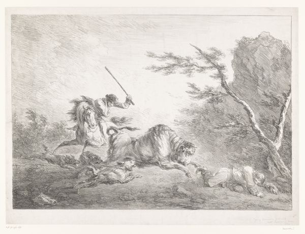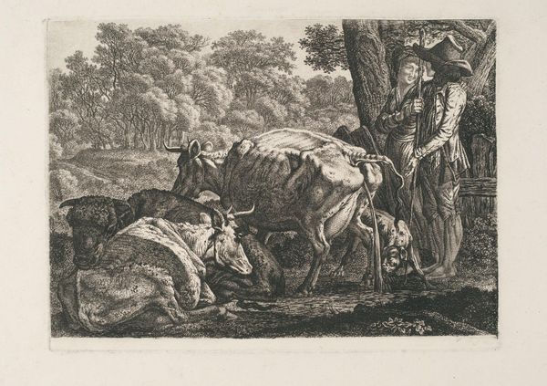 Herman van Swanevelt made this etching, "Koeien", meaning "Cows" in Dutch, sometime in the first half of the 17th century. It shows two cows in a field with a shepherd. Produced in the Netherlands during its Golden Age, this print speaks to the nation's burgeoning sense of identity, deeply rooted in its agriculture and landscape. We see the shepherd tending to his animals. He’s not an idealized classical figure, but a common man at one with the land. The etching technique itself, with its reproducible nature, democratized art, making it accessible to a broader public. Prints like these found their way into homes, shaping perceptions and solidifying cultural values. To truly understand this work, consider the economic prosperity of the time, the rise of Dutch realism in art, and the social structures that celebrated rural life. The historian's task is to uncover these layers, using archival records, contemporary accounts, and art historical analysis.