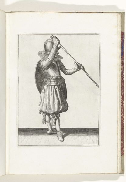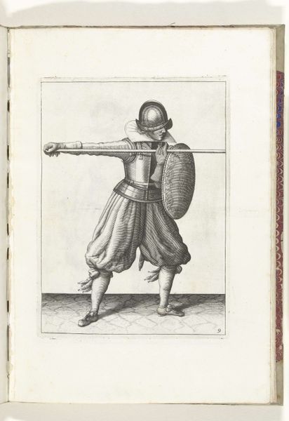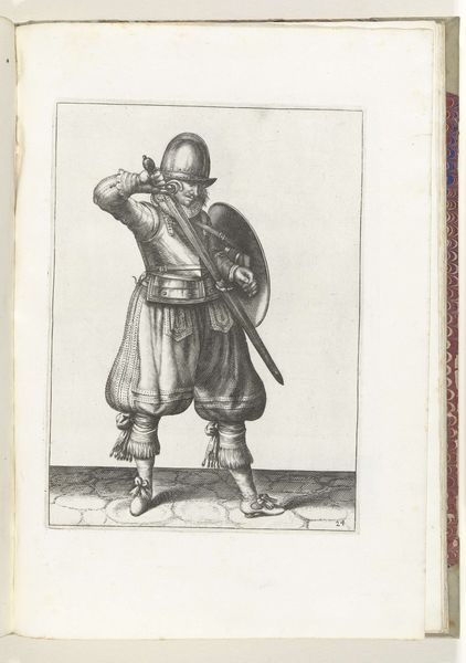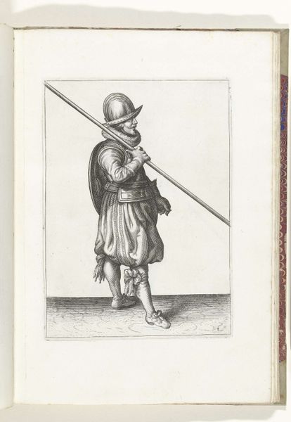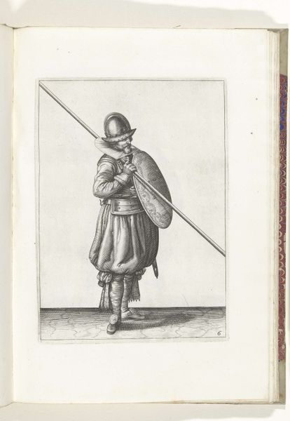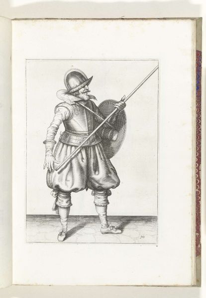 This print, made in 1618 by Adam van Breen, shows a soldier with a shield and spear, readying for battle. The printmaking process itself is crucial here. The fine lines were likely achieved through etching or engraving, techniques demanding precision and skill. Think of the labor involved in creating each mark, each line contributing to the overall image of military readiness. The texture of the print, though subtle, adds depth to the soldier's gear, from the polished helmet to the heavy fabric of his trousers. The material qualities of the print also speak to its social context. In a time before mass media, prints like these were vital for disseminating information and standardizing military training. They were a means of conveying knowledge and skill, contributing to the organization of labor and power within the military. Ultimately, this print reminds us that even seemingly simple images are deeply embedded in processes of making, social structures, and cultural values. It challenges us to look beyond the surface and consider the labor and context that give an artwork its full meaning.