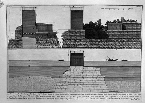 Editor: Here we have "The Roman Antiquities, t. 4, Plate XXIII. Plant and inscriptions of Cestius Bridge," an etching by Giovanni Battista Piranesi. It’s all incredibly detailed, almost scientific in its precision, and I’m struck by how he manages to make architecture feel almost… archaeological? What do you see in this piece, something that might elude a less trained eye? Curator: Ah, Piranesi. He’s not just showing us a bridge; he’s peeling back layers of time, isn’t he? Notice how he combines accurate architectural rendering with… well, a romantic’s soul. The precise lines showcase the Roman engineering genius, but that dramatic lighting, those almost theatrical shadows? It's as if he's conjuring the ghost of the bridge itself. I wonder, do you feel a sense of loss here, for something grand that's also decaying? Editor: I do, now that you mention it. The cross-sectioned view feels like an autopsy, revealing the inner workings while also hinting at mortality. Was Piranesi perhaps commenting on the decline of Roman power? Curator: It's tempting to read it that way, isn’t it? Although, he was more invested in capturing the magnificence of Rome’s past, perhaps a nostalgic look backwards in a period of renewed classicism. Instead of only illustrating decline, perhaps it is just more of a desire to record for posterity. Look at all the inscriptions. Those aren't just decorations but records. Editor: That’s true; I didn’t think of it as a form of preservation. He's documenting, as much as he is creating art. So, it’s a little less about a statement on the decline and more about ensuring it won't be forgotten. I learned something new today. Curator: Exactly! He is capturing the granduer. It's why, centuries later, we can still ponder not just a bridge, but also the echoes of an empire, suspended in ink and paper. A journey back, not to simply observe ruins, but to feel their breath once more.
