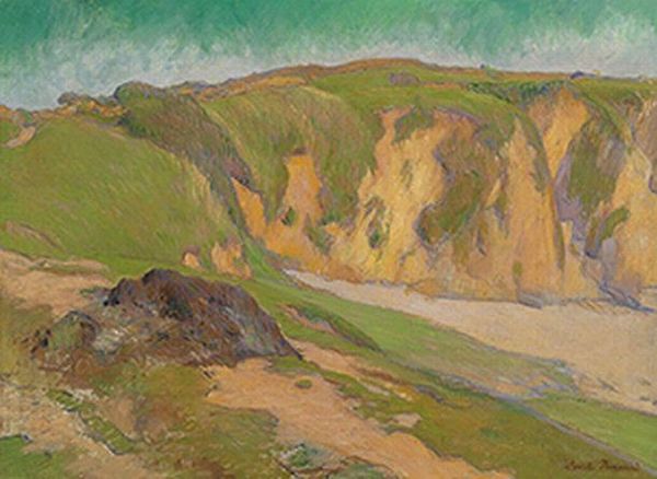 Curator: This is Alfred William Finch's "The Cliffs of Dover; The Cliffs at South Foreland," an oil painting created in 1892. What strikes you first about it? Editor: The sheer texture! It feels almost tactile. All those little dots of color shimmering in the light; you can practically feel the coastal mist on your skin. Curator: Finch, deeply embedded in Post-Impressionism, uses Divisionism, that application of distinct dots of colour, to create the image. He lived in Belgium and Finland and here, seemingly on the coast of England, the cliff’s whiteness perhaps signifies the English colonialism of that era; the divisionism is not just an artistic method but a reference to the social divisions of Europe at the time, too. Editor: Fascinating. Speaking formally, the pointillist application of paint really allows light to enter the composition in an unconventional way, especially when viewed from a distance, dissolving forms into light and shadow. Observe how the complementary blues and oranges intermingle to generate a vibrant visual experience and the atmospheric perspective gives a real sense of depth to the scene. Curator: Certainly. It’s interesting to view this through the lens of labour and leisure. Impressionism, and movements following, can often be viewed as products of increasing urbanisation, the slow emergence of the working class and even increasing demands and movements of and for female empowerment. Do you feel those narratives are at play in this image? Editor: That’s an interesting concept. While such theories offer one interpretation, one might also look closely at Finch’s skillful command of colour theory to explore his mastery of Divisionist technique within landscape painting; to study the very structures that produce meaning through visuality. Curator: Undoubtedly both considerations allow deeper readings of Finch’s artistic contribution to the late 19th Century art scene, a fascinating insight into the complexities of modern life. Editor: A final glance reveals how Finch uses such small, specific gestures and hues of light and colour to generate and offer viewers so many intricate forms that cohere as a whole image. It’s just amazing to observe!