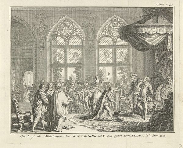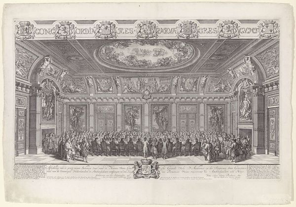 This engraving, made in 1689 by an anonymous artist, commemorates the coronation of William and Mary as King and Queen of Great Britain. The print provides insight into the political theater of the late 17th century, a period marked by shifting power dynamics and religious conflict. Notice how the composition is structured, with the royal couple elevated on a platform, surrounded by clergy and nobility, while a crowd of onlookers fills the foreground. This hierarchical arrangement speaks to the rigid social structures of the time, where status and lineage determined one's position in society. The very act of crowning symbolizes the divine right of monarchs, a concept that was both embraced and challenged during the Enlightenment. Consider how gender plays into this historical narrative. Mary's presence as co-ruler challenges traditional patriarchal norms, yet her power remains intertwined with her relationship to William. This engraving is not just a record of a historical event. It’s a window into the complex interplay of power, religion, and identity that shaped the course of British history.
