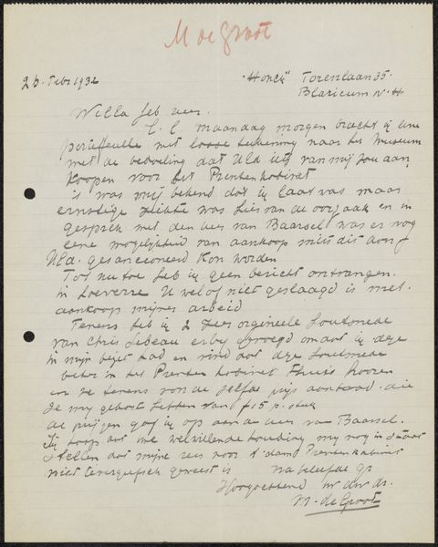 Curator: Let’s turn our attention now to "Brief aan Willem Bogtman" by Richard Nicolaüs Roland Holst. This piece, likely created between 1931 and 1939, showcases the artist's handwriting in pen and ink on paper. It’s currently held at the Rijksmuseum. What are your initial thoughts? Editor: It’s intimate, isn't it? Raw in a way. I immediately focus on the handwritten quality of the work: it is about mark making, production, and labor when a note gets rendered with immediacy by the writer's own hand, the artist's tools, and paper and ink materials to bring it into existence. Curator: Indeed. The act of writing itself takes center stage. Look closely—notice the rhythm of the handwriting and how the penmanship lends its unique voice through these visual symbols and imagery? It speaks volumes about Roland Holst’s personality, as if we are somehow intercepting a private conversation with Willem. The way it fills the space makes me wonder about Roland Holst's message. Editor: Good eye. Because while on the surface it’s just correspondence, letters have long been tools for intellectual exchange and social engagement. To me, a letter embodies labor: the labor of physically forming the letters, sure, but also the work of thinking through ideas, communicating them with precision, and enacting social rituals by communicating at a remove, instead of immediately. Curator: I agree. Letters, particularly handwritten ones, function almost like artifacts, imbuing emotion with a feeling of presence—they carry a historical significance that speaks to me on many levels. This one feels weighty, somehow. Editor: And isn’t that weight also due to the very portability of letters? They are documents of their era, encapsulating the limitations of technologies while pointing to new material horizons enabled by trade, colonialism, postal systems, and personal networks. Curator: Absolutely. It’s more than a message. The artifact’s surface acts as both a carrier of ideas and historical evidence. It speaks across time. Editor: This quick look made me think of all that's at play even in a seemingly simple act: correspondence, a dance between intimacy and the historical landscape. Curator: Yes, a dance indeed, offering us all a glimpse into both personal exchange and broader societal factors.