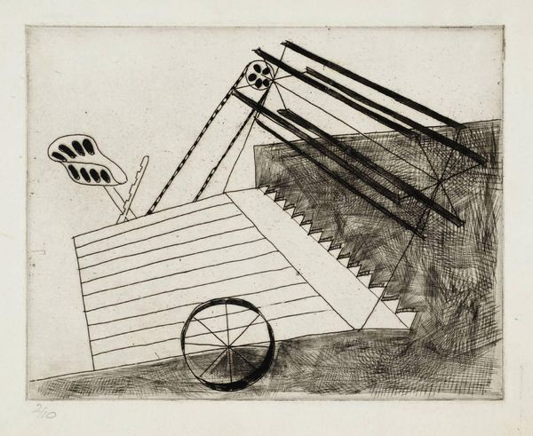 Editor: This is Richard Hamilton's "Reaper (j)," an undated etching from the Tate collection. It's quite abstract, almost like a technical diagram. How do you interpret this work within a broader social context? Curator: The starkness and mechanization suggest a commentary on industrialization. Consider Hamilton's position: how did post-war anxieties around technology influence his artistic choices and the public's reception of such imagery? Editor: So, the abstraction isn't just formal, but a reflection of social anxieties? Curator: Precisely. The print's limited edition also suggests a specific audience, perhaps one engaged in intellectual discourse around these themes. What do you think that says about the role of art? Editor: That's a powerful way to see the relationship between art, society, and the artist's intentions. Curator: Indeed. Understanding the historical currents helps us decode the visual language.