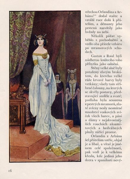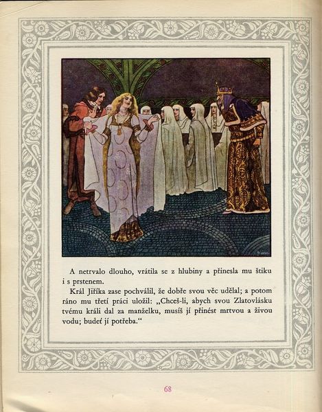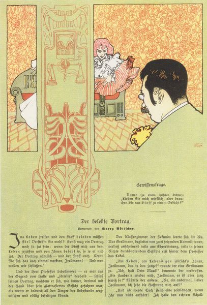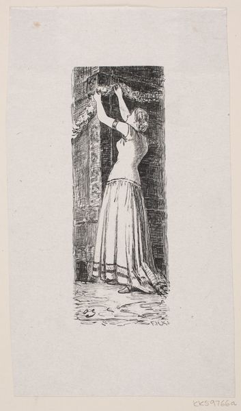 Curator: Let's delve into this "Illustration for Zlatovláska" by Artuš Scheiner from 1911. What catches your eye when you first look at it? Editor: It feels like stepping into a fairytale. The colours are muted, and the woman, presumably Zlatovláska, has this dreamy, almost ethereal quality. The text integrated into the image is an interesting choice. What's your interpretation? Curator: I love that "stepping into a fairytale" description! Scheiner's work, firmly rooted in Art Nouveau, invites us to consider the intersection of image and text. Notice how the flowing lines of her gown echo the swirls in the border and the very form of text. The Czech Art Nouveau artists loved symbolism and this piece is imbued with it! Consider how the long hair becomes a central element - how does that contribute to the narrative? Editor: The hair really draws you in, it’s so prominent. Does it symbolize something specific within the story itself? Curator: Indeed! Golden Hair, Zlatovláska in Czech, is the giveaway - the impossible quest in so many fairytales is finding that thing of unique and irreplaceable value. Imagine reading the story along with this illustration - doesn't the artwork deepen your understanding? Perhaps heightening the mystery... Editor: Absolutely, the artwork enhances the magical feel. I hadn't really considered the symbolism of the golden hair so deeply. Curator: It’s a visual reminder of the core narrative, isn't it? What does the combination of text and image do for the audience? It grounds it, and it elevates it. It's an entry point but also an artistic interpretation, giving another perspective on a well known narrative. It also brings to light the artistry behind book illustrations. Editor: I see what you mean. It makes me appreciate the detail and the layers within the illustration. Thanks for pointing that out! Curator: My pleasure! Every artwork offers its unique doorway. What's important is we're always open to step through and listen to what it has to say.