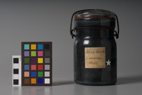 Curator: The Harvard Art Museums hold this intriguing object, "Noir de Vigneis," produced by Le Franc. What do you make of it? Editor: It's strikingly simple, a study in contrasts, isn't it? The clear glass jar against the dense black pigment inside. A dialogue between transparency and opacity. Curator: The name itself, "Noir de Vigneis," evokes a sense of place and history. Vigneis, perhaps a region known for vineyards, hints at a connection to the earth and the traditions of making. Editor: It also makes me think about containment, preservation. How the materiality of this pigment, once vibrant, is now stilled. Curator: Yes, and the vessel that holds it, the jar, becomes a symbolic archive, preserving a piece of cultural memory. Editor: Precisely. And it speaks volumes about the art-making process itself—the raw materials, the transformation. It reminds us that art has a material basis. Curator: Indeed. A humble yet potent reminder of the alchemy of creation. Editor: A quiet testament to the enduring power of color and form.