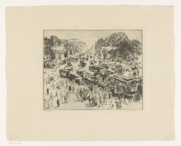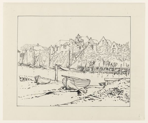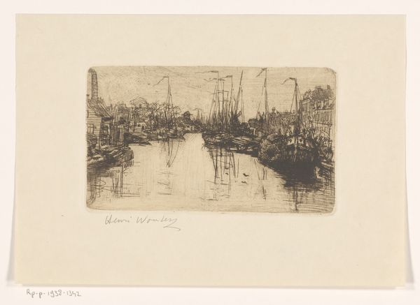 Willem Bastiaan Tholen created this etching, "Kanaal met schuiten," using a metal plate, acid, and printing press. The etching process allows for the creation of fine, detailed lines, evident here in the depiction of the canal, boats, and surrounding landscape. Tholen would have coated a metal plate with a waxy, acid-resistant substance, then scratched his design into it. Immersing the plate in acid would bite into the exposed metal, creating grooves. Ink is then applied to the plate, filling these grooves, before being pressed onto paper. The print's linear quality emphasizes the industrialized waterways and working vessels. This etching is a powerful record of the Netherlands' dependence on its canals for trade and transport. The image shows the amount of labor involved in the production process. Understanding the materials, process, and context allows us to fully appreciate Tholen's work. It is a scene of everyday life elevated through skilled handwork.