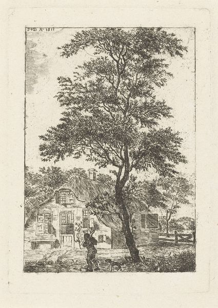 Curator: There's a lovely calm to this work; it's an etching and engraving on paper, dating from between 1809 and 1837, entitled "Landschap met boom, brug en huis" – or, "Landscape with tree, bridge, and house" – created by Pieter Bartholomeusz. Barbiers, now residing here at the Rijksmuseum. Editor: It feels incredibly detailed. I'm drawn in by the sheer quantity of individual marks that compose the scene. How was such intricacy even achievable? Curator: Well, the work's achieved through a combination of etching and engraving, a process that would have been fairly laborious. Barbiers likely would have started with a metal plate, covering it in a wax-like ground. He’d then sketch his design, exposing the metal where the lines are drawn. Then comes the etching – immersing the plate in acid, which bites into the exposed lines. Engraving provides sharper lines after the plate is acid etched. All a dance of labor and corrosive chemistry. Editor: So, the finished print is a direct result of a collaboration between the artist, the materials he had on hand, and the processes involved in manipulating them. How was an image like this typically consumed at the time? Curator: Prints like these had multiple functions. Commercially, they were sold individually or as part of bound collections, providing affordable access to art for a wider audience than paintings alone. They also served a crucial function in shaping cultural ideas about landscape and nationhood at a critical juncture. Picturesque scenes became almost like nationalist emblems. Editor: Interesting how these depictions could be consumed on an individual basis through prints, impacting a sense of collective identity in an emergent Dutch state. What about Barbiers' background—did it influence the social commentary imbued in these images? Curator: Barbiers came from a family of artists. He absorbed traditions of landscape and genre painting that were being transformed. This print sits right at the cusp of the Romantic movement. Consider how it leans on close observation and fidelity. He used it as a mechanism for translating that vision onto paper, shaping how a local audience would interpret nature. Editor: And in turn, reflecting Barbiers place within, and perhaps his reaction to, emerging markets for art during the height of Romanticism. It speaks to a wider economy where artistic expression becomes intricately bound with audience perception and evolving artistic trends. I'm grateful for your material and historic perspective! Curator: It is, indeed, where artistic vision meets social context, and that gives "Landschap met boom, brug en huis" a relevance that goes far beyond its charming surface.