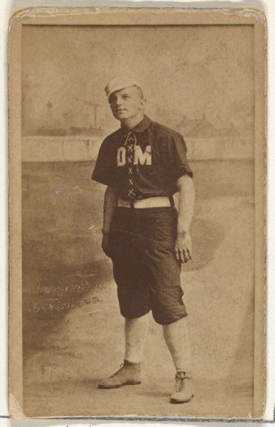 This is "James Wear "Bug" Holliday, Center Field, Cincinnati" from the Old Judge series, a photographic print made around 1887 by Goodwin & Company. The sepia tone flattens the image into a study of tonal gradients, its focus on form and structure heightened by the limited palette. Holliday is depicted in his baseball uniform, the laces of his shirt and the band around his waist creating geometric patterns against the soft focus background. The composition is simple, yet deliberate, positioning Holliday as a figure within a carefully structured space. This interplay of figure and ground raises questions about representation and identity. The photograph flattens the depth of field, reducing Holliday to a set of forms. Consider how Goodwin & Company used the then relatively new medium of photography to create this image. It's not just a portrait, but an exploration into how a figure can be reduced to constituent parts and still convey meaning. The image invites us to consider the visual systems at play and how they communicate ideas about sport, identity, and representation in late 19th century America.