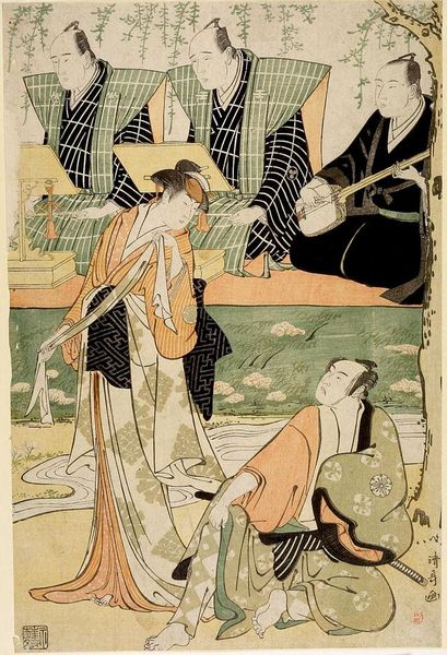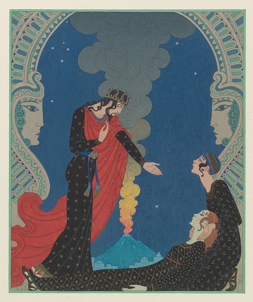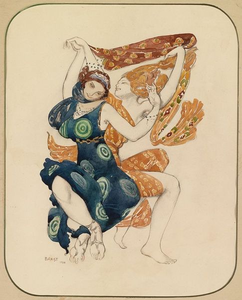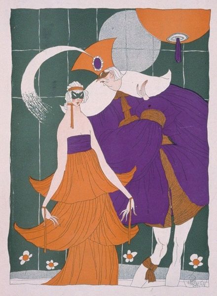 Curator: Look at this interesting work on textile and watercolor. It’s called "Love, Desire, and Death," and it's by George Barbier. It feels almost like a medieval tapestry in its design. Editor: My initial impression is one of bittersweet fantasy. The color palette is whimsical yet there is this definite dark figure playing music. It feels like an allegory, like something out of a fable. Curator: It is striking how Barbier merges stylistic elements, isn’t it? We can read medieval tapestries into the staging of the figures and the clear design-oriented intention in the execution, but these are characters firmly within the artist's time, referencing modern ideas about symbolism, performance, and fashion. Editor: Exactly. Take that jester, for example, complete with the skull face, standing in for death. It’s such a classic symbol—a *memento mori*, reminding us that even amidst love and desire, death is an inescapable presence. The two figures alongside Death form such an evocative sequence, perhaps about the ages of woman. The bird pair looks ominous. Curator: These recurring symbols can tell us something about what was at stake socially and culturally. With World War One still lingering in the very recent past, there was an acknowledgement of what can and cannot be maintained culturally, politically, and socially. To what extent are they a comfort, a warning, or a fantasy? These all coexist here. Editor: Definitely a potent concoction of yearning, premonition, and perhaps a touch of dark humor. And the inclusion of the unicorn… Such a fascinating, multifaceted creature, signifying purity, grace, and the unobtainable. Its downward gaze makes the scene all the more poignant. Curator: The politics of imagery! I agree. A very timely visual metaphor. And, given the role of artists such as Barbier at this time—often involved with the production of lavish fashion and theater magazines—these potent and highly symbolic elements, circulated widely, contributed to a rich symbolic landscape in which to situate oneself and interpret culture as a whole. Editor: Barbier has certainly given us plenty to think about. This piece serves as a gentle but persuasive reminder to reflect upon life’s beauties and vanities. Curator: And, more broadly, this type of image reminds us how art and artists responded in nuanced and imaginative ways to societal circumstances.