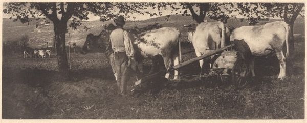 Curator: Let's delve into this gelatin-silver print titled "Hooiende leerlingen van Schule Schloss Salem," taken around 1929. We see students harvesting hay. Editor: My first impression? A yearning. This scene, captured in monochrome, speaks to the quiet rhythm of labor. It's incredibly serene, yet slightly melancholic—like a memory fading at the edges. Curator: It is precisely this melancholic undertone that fascinates me. Taken at Schule Schloss Salem, a boarding school in Germany with ties to progressive education and founded in the aftermath of WWI, the photograph can be understood within the social context of the period, questioning the ideals of labor and social reform. Editor: Progressive ideals… or a pastoral fantasy? The image feels curated, like a performance. See how their postures, almost artful, especially those shirtless boys hauling? It reminds me of idealized socialist realist painting, only rendered in the cool remove of a photograph. Curator: The lack of explicit emotion contributes to a more nuanced reading, allowing the photograph to function as both a document of and a commentary on the educational philosophy of the time, in a society that sought to reconcile social progress with traditional structures. Gender and class roles are being silently negotiated. The presence of onlookers even seems to reinforce such ideas. Editor: It's precisely this tension—the real versus the constructed—that captivates me. Is it capturing genuine experience, or is it promoting an aesthetic? Look at the tones, this play of light… almost as if painting on the darkroom. It has a painterly quality that lends the whole scene a dreamlike quality. I am really fond of its textures and the whole setting under that misty afternoon light. Curator: Absolutely. The anonymous photographer seems less interested in stark documentation and more inclined to evoke a mood—a moment in time laden with the anxieties and aspirations of a changing society. It becomes less about these individuals, and more about the laboring body, and their relationship to the land, which are powerful themes explored from very different positions, but certainly by examining Romanticism. Editor: True! Perhaps the heart of its message is about embracing the physicality and the tangible amidst uncertainty and progress. After all, they're creating something very material here, stacked to the sky. Curator: Thank you for so poignantly expressing your interpretation. Your artistic eye captures layers of meaning. Editor: Well, thank you. Sometimes, feeling the dirt beneath your fingernails is the only thing that grounds you, isn’t it?
