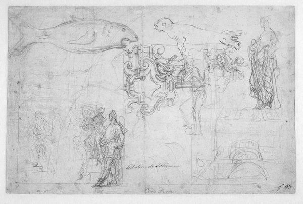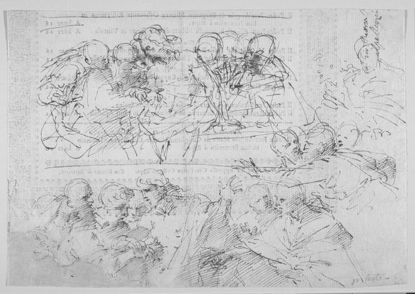 Editor: Here we have an 18th-century drawing, "Phineus and his companions turned to stone," artist unknown. It looks like it’s made with pencil, ink, and maybe some charcoal. It strikes me as incredibly dramatic, full of chaotic energy. What do you see in this piece, from a historical perspective? Curator: This drawing plunges us into a specific cultural moment where mythological narratives served didactic purposes. It illustrates a scene of divine retribution from Ovid’s Metamorphoses. Think about how history paintings, even in preparatory sketches like this, played a role in shaping public morality and political ideals. Notice the expressions—can you see how they might communicate a particular ideology, perhaps one about the consequences of hubris? Editor: It’s interesting how you frame it in terms of public morality. I mostly just saw the drama, the sheer terror on their faces! Was there a particular political angle common to these depictions? Curator: Absolutely. These images often served to reinforce existing social hierarchies. The "turning to stone" motif could symbolize the petrification of dissent, the silencing of opposition. In whose interests do you think that narrative might have been? Consider who would have commissioned and viewed such artwork. Editor: So, it’s not just a dramatic scene; it's a cautionary tale about challenging authority. Looking at it that way, I can definitely see how it might function in the public sphere. It really makes me think about who gets to tell these stories, and what messages they are trying to send. Curator: Precisely. And it encourages us to examine the broader socio-political function of art beyond aesthetics. Editor: That definitely provides food for thought. I'll never look at a history painting the same way again!