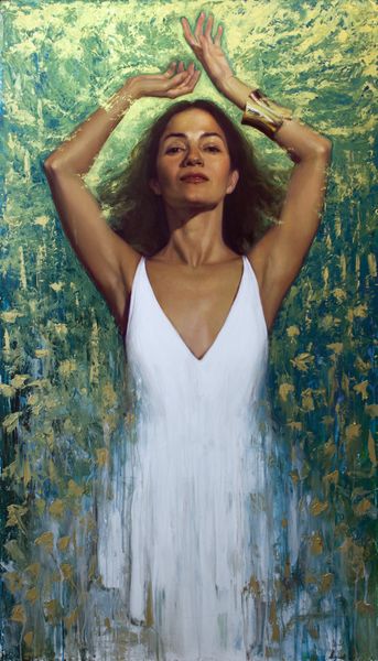 Monica Ikegwu made "Crossing" with oil paint, and right away you can see she's thinking about how colors vibrate against each other. It's like a quiet hum you can almost feel. There's a push and pull between the smooth skin and the more angular background, which creates an interesting tension. Look at how the light catches the knuckles, each one a tiny landscape of color. And notice how those fierce nails echo the lines behind her – like she’s part of the architecture, or maybe the architecture is part of her. This piece has a controlled energy, a deliberate use of color and form. I am reminded of Lynette Yiadom-Boakye, the way she builds her figures out of color relationships, suggesting a world of feeling with a few well-chosen tones. Isn't it wild how a painting can hold so much without saying a word?