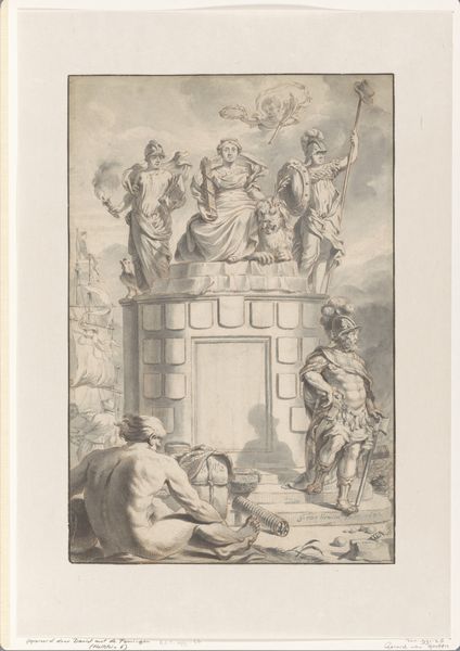 Jan Goeree made this drawing, “Female Figure Holding a Coin and Image of a Fountain,” sometime between 1680 and 1731, using pen and gray ink with gray wash on paper. Goeree lived during the Dutch Golden Age, a period of immense economic and cultural growth for the Netherlands. The drawing shows a woman holding a coin with a fountain image, referencing classical antiquity, a common theme in art of the time, reflecting the period's interest in ancient cultures. The woman could be interpreted as an allegory of abundance, displaying the source of wealth for the city. The use of a female figure to symbolize civic values is noteworthy. The way the female form embodies abstract concepts reflects the gendered expectations of the time, where women were often used as symbols. It invites us to reflect on the historical relationship between gender, representation, and civic identity. The artist is asking us to consider the foundations of wealth, power, and the narratives they construct.