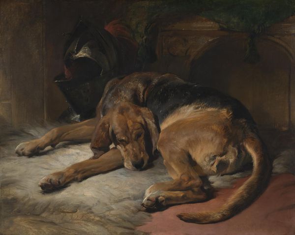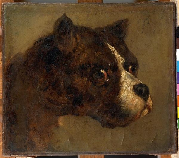 Curator: This is Henriëtte Ronner-Knip's painting, "Two Friends," executed in oil paint using an impasto technique. It's a delightful glimpse into domestic animal portraiture. Editor: My first impression is one of unexpected harmony. The subdued palette emphasizes the textures of fur, while the shared shadow creates a visual connection between these two unlikely companions. Curator: The symbolism of a dog and cat together immediately raises questions about the breaking down of traditional symbolic oppositions. Ronner-Knip was renowned for her genre paintings featuring animals. Could this work be reflective of broader shifts in societal ideas? Editor: That's an interesting proposition. Visually, however, it is striking how the artist contrasted their shapes. The round fluffiness of the cat beside the lean angularity of the dog creates an engaging compositional tension. The eye is led around this painting with masterful ease. Curator: Precisely! Beyond mere visual appeal, the pairing likely held cultural weight for viewers. In many European households, these pets were valued and perhaps came to represent stability and loyalty during rapid urbanization. Animal portraiture started to signal emotional wealth in many bourgeois homes. Editor: So the animals here are doubling as emblems of bourgeois domestic tranquility? The textures absolutely reinforce this. The application of the impasto heightens that sense of cozy comfort that perhaps mirrored values upheld by the painting's original owners. Curator: I think that’s absolutely spot on. It would be compelling to study these paintings from both an art historical, and societal perspective, mapping how animals acted as mirrors, reflecting humanity back at itself. Editor: Indeed! It's a striking portrait where even simple technical elements can be loaded with unexpected symbolism.