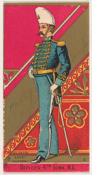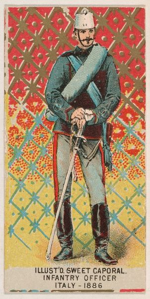 Editor: This lithograph, titled "Engineer Corps, Spain, 1886" from the Military Series, was created in 1888 by the Kinney Tobacco Company as an advertisement. I’m immediately struck by its odd formality combined with a almost cartoonish feel. What am I missing here? Curator: Ah, a curious collision, isn't it? It's like a soldier posing for a heroic portrait but with a playful wink. Notice the profile view, common in both classical art and, well, cigarette cards. The Kinney Brothers were clearly tapping into a sense of exoticism. Spain, in the late 19th century, held a certain romantic allure, conjuring images of Moorish Spain, bullfights, and the Carlist Wars. Do you feel any of that exoticism radiating from our engineer? Editor: Hmm, now that you mention it, the backdrop—all those stylized gears and tools—sort of feels like a distorted Moorish design. Is that intentional, you think? Curator: Perhaps. Or perhaps it's pure aesthetic flourish designed to catch the eye in a tobacconist's shop. Remember, these cards were ephemeral, little bursts of colour in a world that was, photographically speaking, largely black and white. Did you also note the pickaxe in his hand as both weapon and working instrument? That tells us something of this solider's duty and position in life, a worker and a protector of his nation. Editor: That's a great point. I was so focused on the overall image; I almost missed the significance of that small detail! It's interesting how such a commercial piece can also reveal glimpses into cultural perceptions of the time. Curator: Precisely! These little snapshots offer surprisingly layered perspectives, reminding us that even advertising can be a time capsule, wrapped in artistry and filled with unspoken stories. They give us little sparks, as they reflect the hopes and visions and, yes, even stereotypes of their historical moment.