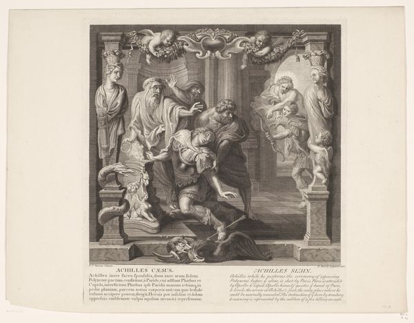 Edouard Schuler created this print, *Apotheosis of Wolfgang Amadeus Mozart,* sometime in the 19th century. The print, rendered in subdued grey tones, presents Mozart seated centrally, a muse crowning him with laurels. The composition is structured around an archway filled with angelic figures. It creates a sense of elevation and reverence. The arch frames a scene where Mozart is flanked by allegorical figures, his likeness idealized through smooth lines and balanced proportions. This formal arrangement reinforces the concept of "apotheosis," or deification, positioning Mozart not merely as a composer but as an immortal figure. The piece subtly challenges fixed meanings by elevating Mozart to almost divine status through classical allegories. The meticulous execution and balanced composition create an aesthetic experience that invites contemplation on the nature of artistic genius and its cultural veneration. It's not just a portrait; it's a structured argument about legacy and artistic immortality.
