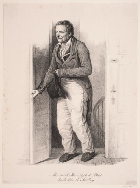 Curator: Well, hello there. Let's meander a bit through art together! Editor: We’re looking at Paul Gavarni's lithograph from 1858, “Inspecteur privé des travaux publics.” The mood is wonderfully observational; he seems like a man caught between dreaming and doing, framed against this construction backdrop. What do you read into his story? Curator: Ah, Gavarni! What I sense here is not just observation, but almost...a yearning. His gaze isn't fixed, is it? There’s something about the upward tilt, coupled with that slightly bewildered expression, that hints at a world unseen, an aspiration maybe a touch beyond his reach. It whispers of the everyday anxieties of wanting something more, amidst the dust of the ordinary, don’t you think? A quiet revolution perhaps brewing in the heart of a bowler-hatted bloke. And isn’t it delicious how he placed the poor chap by those rudimentary scaffolding - symbolising "potential", literally under construction - while he seems ever-so-slightly out of place? Editor: Yes! And the title adds another layer, this “private inspector”. There’s irony there. He's official, yet almost invisible. Curator: Precisely! The charm of Gavarni's social commentary comes from finding grandeur in the mundane. But then again, I can be overly poetic when something tickles my fancy. Editor: No, no, it resonates! The blend of aspiration and subtle satire feels very contemporary, even now. Thanks for unlocking this for me. Curator: And thank you for humoring my whimsy, darling! It is in the dance between art and observation that we come alive, yes?