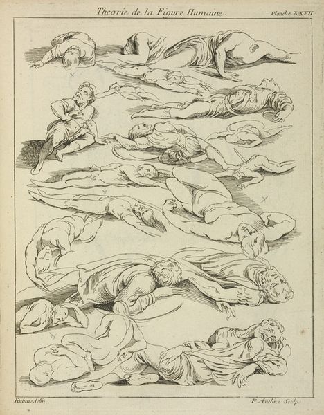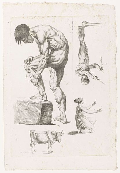 Editor: Here we have "Twee vrouwen en een man," or "Two Women and a Man," a drawing done with ink on paper. The artwork, currently residing at the Rijksmuseum, was likely made between 1679 and 1750 by an anonymous artist. My first impression is the sketch's quirky and spontaneous vibe. What strikes you most about this piece? Curator: It's interesting you picked up on that spontaneity. For me, it’s like stumbling upon someone’s private visual musings. The rough lines and varying levels of detail almost suggest the artist was experimenting, feeling their way through form and composition. Look at how the drapery is rendered, then the faces, quite disparate, almost as if these studies may not all belong together...What do you think that might suggest about the artist? Editor: That’s a great point; I didn't notice that initially! Perhaps the artist was just practicing different techniques, using the same figures to explore different styles? Curator: Exactly! Or maybe the figures are recurring characters in their imagination, re-envisioned time and again. See how they’re positioned almost floating on the page? There's a sense of detachment that I find compelling, a whisper of narrative without being overt. They’re not quite portraits, not quite genre scenes. Editor: So, it’s the ambiguity that makes it interesting? Curator: Precisely! It's like finding a fragment of a dream, a snapshot of a story still unfolding in the artist’s mind. We only see the fleeting glimpses here. That glimpse gives so much possibility for thought! Editor: This piece made me notice how much an initial sketch can offer. Even though the piece feels unfinished in some ways, it captures such a fleeting and interesting view. Curator: Yes, it strips away the polish and artifice, laying bare the very essence of creative process. These unfinished and quickly sketched studies often have the most soul, in my view. A really enjoyable piece to pause and dream with, really.