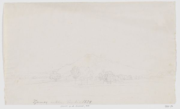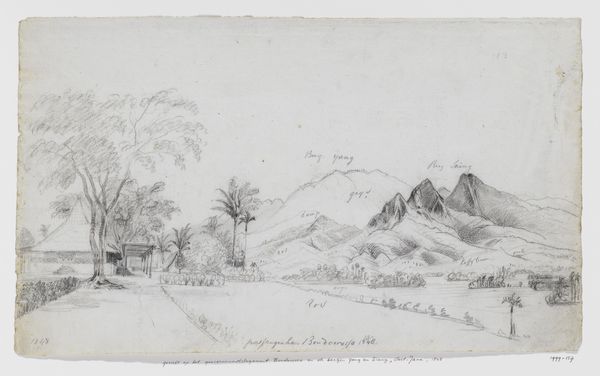 Curator: This pencil drawing immediately strikes me with its tranquil atmosphere. It’s light, almost ethereal, isn't it? Editor: It is quite delicate. We’re looking at Adrianus Johannes Bik's "View of the volcanoes Gedé and Pangrango and the governor-general's residence in Cipanas, Preanger, West-Java," created sometime between 1844 and 1846. Curator: Volcanic landscapes are so powerful, yet the artist renders this scene with such gentleness. There’s something dreamlike in the soft gradations of the pencil strokes. It almost softens the impact, doesn’t it, integrating symbols of immense geological power with everyday life in Cipanas. Editor: It's interesting you pick up on that. While the volcanoes themselves might carry symbolic weight - power, even threat - the composition seems very deliberately designed to diminish any sense of the sublime. Placing the governor-general's residence in the foreground, situating the entire landscape within the confines of colonial power. The local culture, one feels, has been brought to heel. Curator: Perhaps. Or is the artist trying to find a kind of harmony between the imposed order and the natural world? The lines are soft, blending nature and Dutch influence with a muted and considered integration. The light strokes allow the volcanoes, those behemoths of nature, to be symbols not just of power but of constancy. A stage on which the play of colonial life is enacted. Editor: That's a generous reading, although the notion of this as a "stage" certainly resonates. I can't help but think about the act of representation itself here, this impulse to capture and document - to possess a landscape, culturally and politically, through its image. The pencil, the hand of the European artist… these are all tied to the colonial project, aren't they? Curator: They are intrinsically tied. And this interplay between observing and controlling forms part of a complex symbolic dialogue. In some ways, by simplifying such dramatic features in a subtle monochromatic sketch, it suggests that this place and it's people can also be readily understood and governed. Editor: I’m struck by the quiet tension between the scene's seeming placidity and the loaded historical context that Bik would undoubtedly have been aware of. It prompts questions about what this view truly signifies within that era’s socio-political narrative. Curator: For me, it underscores the quiet yet potent cultural encoding of landscapes, then, as now. It has revealed to me how, within this specific moment in history, it serves to re-orient nature towards human comprehension and imperial aspiration.