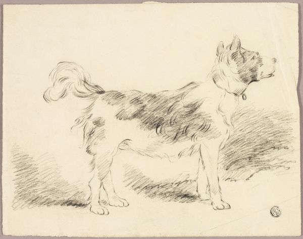 Editor: Here we have Johannes Tavenraat's "Jachthond," a drawing made with ink sometime between 1840 and 1880, currently held at the Rijksmuseum. There's something very immediate and raw about the lines... almost like a quick sketch capturing a fleeting moment. What do you see in this piece? Curator: Oh, I love the energy of this! It's more than just a drawing of a dog; it's about capturing the spirit of the hunt, wouldn't you agree? The dog is alert, poised, with all that implied kinetic energy...and yet it’s just a few deft strokes. It’s evocative; a testament to how much feeling can be conveyed with very little. How does the starkness make you feel? Editor: I guess it's the simplicity of the line that really draws me in; the economy of means to achieve something quite powerful. It makes me think about what details the artist chose to emphasize, like the dog's gaze and the spots on its coat. Why ink? Curator: Ink is perfect for this sort of captured, kinetic immediacy – it flows! It allows the artist to think and draw quickly, and make marks of varying pressure and weight. It has a calligraphic quality to it, wouldn’t you say? It lends a certain… personality, a feeling. There’s also an element of risk: No erasing! Do you think this adds to the emotional content? Editor: Absolutely, the finality adds tension. It makes me wonder if he did many preparatory sketches or if this was the definitive version! It captures such movement with very basic means. Curator: And it succeeds magnificently! It shows you don't need meticulous detail to express feeling; the right marks in the right place can speak volumes. It shows Tavenraat trusted his instinct. I should perhaps trust mine more often. Editor: This was really insightful. Now I see it less as just a drawing and more as a study of gesture, and maybe, a peek into the artist's own intuitive process.
