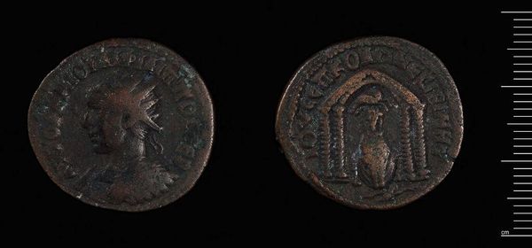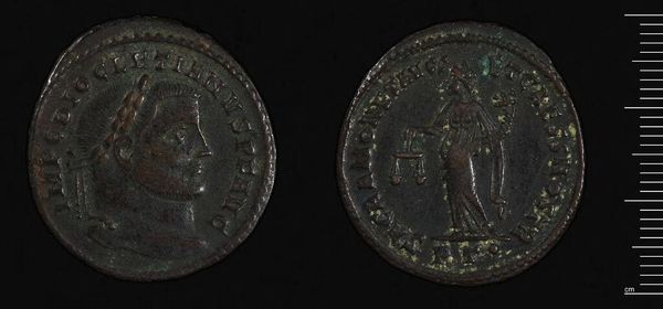Curator: Well, hello! This is a Follis of Constantine I, minted in Alexandria. It really captures something about the man, doesn't it? Editor: It's weighty. Not just in terms of importance, but I can almost feel the heft of it. Sort of grounding, you know? Like connecting to something ancient. Curator: Absolutely. Coins were essential for communicating power. See how his portrait dominates one side, an idealized image meant to project authority. Editor: And on the other side, is that a figure of victory? It feels slightly worn, almost like a whispered promise, not a shout. Curator: That's right, a figure of Victory. These coins were distributed widely, shaping public perception of Constantine's reign. It's propaganda, of course, but also a little work of art. Editor: It's a really tangible link to an empire. Makes you wonder what stories this little coin could tell, the hands it passed through, the places it traveled. It's more than just metal, it's a narrative, isn't it?