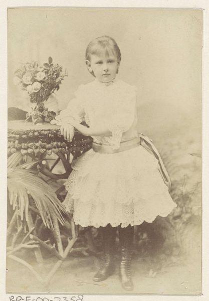 Curator: Here we have an intriguing photograph, “Kind in jurk met donkere schouderstukken en donker lint om het midden, met pop in de armen en plant op de voorgrond” by P. Krabo, likely taken between 1870 and 1910. It’s a small-format, sepia-toned portrait. Editor: Immediately, the child’s solemn expression strikes me. There's a vulnerability that's so present, despite the formal composition. Curator: The composition certainly draws the eye. Krabo’s use of light and shadow defines the form of the child. The photograph uses vertical lines of the plants versus the horizontal of the little girl's ribbon and shoulder accents to great effect. Editor: I'm also considering the trappings of girlhood in this era. The dark ribbon around her waist feels almost constricting, doesn't it? Juxtaposed with her cross pendant, one wonders about the messages imparted to young girls in that period, the doll like another reflection of how they were presented in society. Curator: Interesting, from a purely formal standpoint, that dark ribbon provides a crucial grounding for the figure, anchoring her within the frame, but yes, one may well project beyond that into cultural interpretations. The sepia tones impart a certain melancholy as well, one accentuated by the sharpness of focus on the child. Editor: Absolutely. The doll, too, becomes symbolic—a miniature version of the child herself, meant to be cared for, reflecting the future expectations placed upon her. It speaks volumes about societal roles. Also, the studio address printed at the bottom connects the production of identity with commercial interest of representing sitters who were wealthy enough to frequent studios such as that of P. Krabo. Curator: It does encourage further reflection, doesn't it? A compelling visual artifact that speaks, through form and subject matter, to ideas that persist well beyond its creation. Editor: Indeed, it reminds us that even seemingly simple portraits hold layers of meaning, inviting us to question the narratives they present and whose interests they served.
