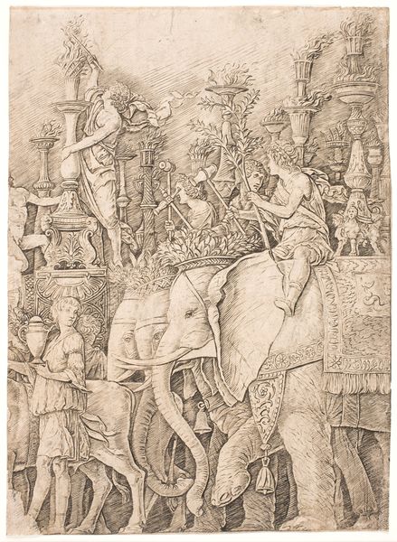 This print, "The Triumph of Caesar: The Elephants," was created by Gian Marco Cavalli around 1500 using engraving, a process of incising lines into a metal plate to hold ink. The stark contrast between the black lines and the white paper creates a dramatic scene. To make this print, Cavalli would have used a tool called a burin to carefully carve lines into a copper plate. The depth and spacing of these lines determine the tonal variations we see in the print. Note the incredible detail, from the folds of the garments to the texture of the elephant's skin; these are all a result of Cavalli's skillful manipulation of the burin. Engraving was a demanding technique, requiring both artistic skill and technical mastery. The resulting prints, like this one, were highly valued as both works of art and vehicles for disseminating knowledge and ideas. It’s through the skill of the artist and the laborious process of engraving that this triumphal procession comes to life. The finished work transcends mere image, and becomes a testament to human skill and endeavor.