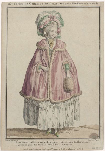This print, made by Franz Ertinger, depicts a fashionable lady in France. Notice how the composition directs our gaze upwards, starting from the textured skirt, moving through the intricate folds of the cape, to the obscured face. The artist masterfully uses line and color to define both form and social commentary. The dark, enveloping cape, rendered with fine, almost lace-like lines, contrasts with the skirt's geometric pattern, suggesting a tension between concealment and display. The artist uses diagonal lines to emphasize the cape's enveloping quality. The subtle color palette, dominated by muted purples and grays, evokes a sense of understated elegance, typical of French fashion. Consider the title, which translates to "Woman of quality going incognito in the City." What does it mean to be 'incognito'? The print challenges fixed social categories, suggesting that identity can be fluid and performative. It invites us to reflect on how fashion shapes our understanding of social roles.
