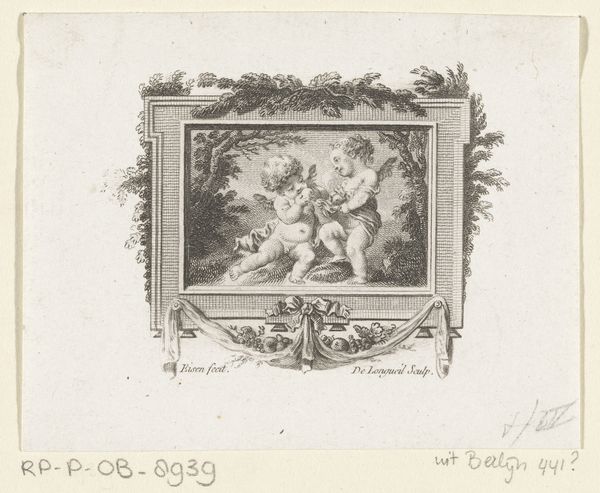 Joseph de Longueil created this small etching titled 'Vignet met vijf putti', sometime in the late 18th century. The vignette is a window into the visual culture of the Rococo period, where idealized cherubic figures were a common allegorical motif, often deployed to explore themes of love, innocence, and play. But let's think about this image in relation to the era’s social hierarchies and norms. The putti, with their implied innocence, were often employed by the aristocracy to suggest a sense of naturalness. At a time when the social order was anything but natural for the majority of the population. The image can be read as a form of cultural rhetoric, one that reinforces the status quo through idealized visions. The cherubs innocence contrasts starkly with the realities of child labor. The personal and the political intertwine in this image, reflecting a broader societal tension between lived experience and aspirational fantasy.
