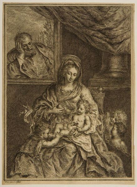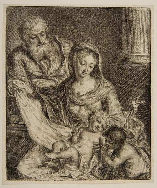 Curator: Here we have "Holy Family," a work by Barthholomäus Ignaz Weiss. It presents a classic subject matter, rendered with a striking tenderness. Editor: The first thing that strikes me is the texture; there's a real emphasis on the rough and tactile nature of the medium itself. Curator: Absolutely. Considering the social and religious context, depictions of the Holy Family often served to reinforce patriarchal structures and idealized notions of motherhood. Editor: The hatching and cross-hatching suggest labor, the sheer amount of time spent on this piece. Is Weiss making a statement about the labor inherent in devotion? Curator: That's a compelling question! It prompts us to consider not only the religious symbolism but also the material reality and production behind these devotional images. Editor: I am thinking about the means of production... the choice of medium, the labor involved... It enriches our understanding, doesn't it? Curator: It certainly does. It shows how art can be both a product of and a commentary on its time.