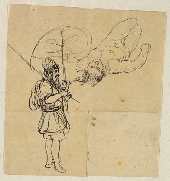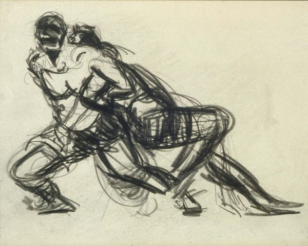 Curator: Rodolphe Bresdin, who lived from 1822 to 1885, captured this intense fracas in his piece, "Two Men Fighting," housed here at the Harvard Art Museums. Editor: It's so raw, almost like a primal scream captured in ink, isn't it? You can feel the struggle, the desperation. Curator: Absolutely! Bresdin was a master of detail, even on such a tiny scale—it’s only 3.5 by 2.9 centimeters! Notice how the figures are intertwined, almost inseparable in their conflict. This alludes to struggle as a universal symbol. Editor: That interlocking speaks to a deeper psychological connection. It makes me think about how conflict shapes identity, how we define ourselves against what we oppose. It's a really visceral rendering of opposition. Curator: It's Bresdin wrestling with his own demons through the pen. Editor: I think that the image really succeeds, as it doesn't feel specific to Bresdin, but rather is a commentary on identity overall. Curator: Yes, and that makes it so very enduring, something we all can relate to.