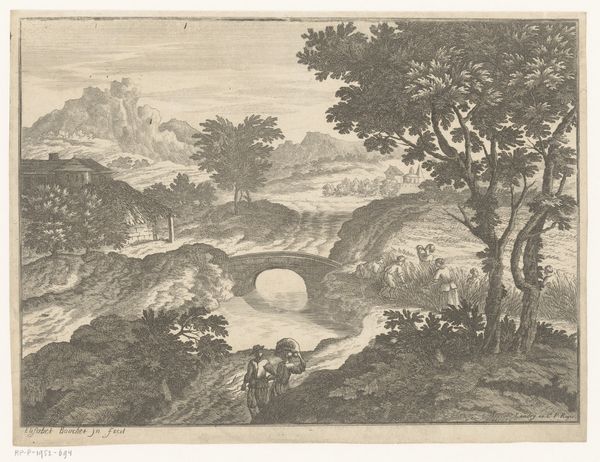 Stefano della Bella created this etching, ‘Roman Landscapes and Ruins’, capturing a pastoral scene within a circular frame. The resting horse is central; a symbol of vitality and nobility, now at rest, hinting at the transience of power. Consider how this motif echoes in equestrian statues across Europe, where horses embody strength and dominion. Here, the horse’s repose invites contemplation on mortality. Similarly, the shepherds recall classical Arcadia, a symbol of idyllic simplicity, yet tinged with melancholy. This longing for a lost, harmonious past is a recurring theme, reappearing in various artistic forms throughout history. The flowing water, an emblem of constant change and the passage of time, contrasts with the enduring mountain, representing stability and timelessness. These symbols tap into our collective memory, resonating with deep-seated emotions about change, stability, and our place in the world.